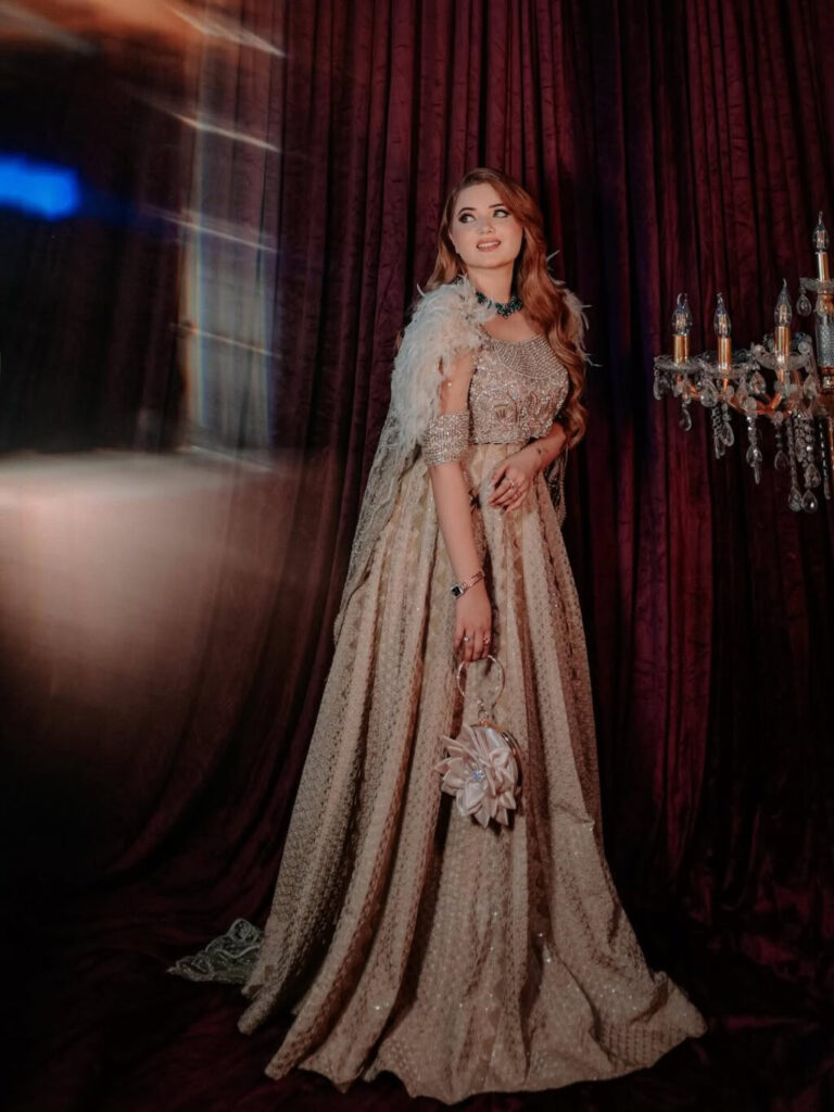 • The Bride-to-Be: She looked breathtaking in a traditional champagne-colored lehenga that sparkled under the lights. Her outfit combined timeless grace with modern charm.