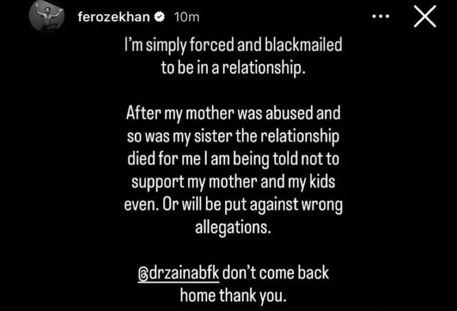 Recently, the controversy resurfaced when a social media page, Shadab Hussain Siddiqui Blogs, posted a screenshot of an alleged story from Dr. Zainab’s Instagram account. The supposed story stated that she was separating from Feroze Khan, mentioning that she could not live with a man who didn’t trust her. It also referred to his “bad behavior” overshadowing their good times together.