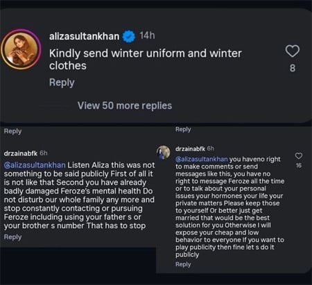 The drama began on Instagram when Aliza Sultan posted a message asking Feroze Khan to send winter clothes and a winter uniform for their child.