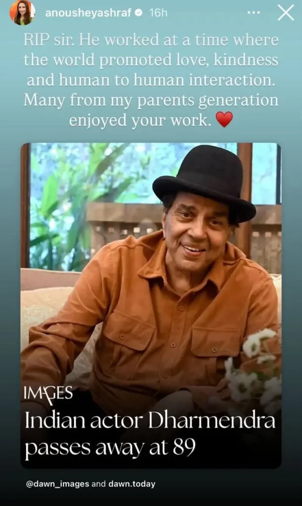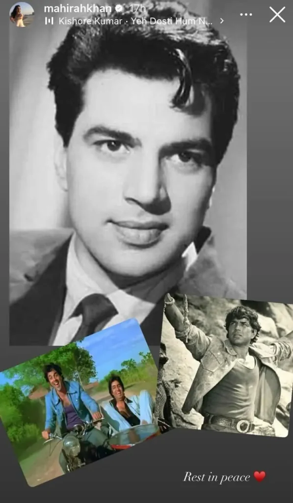 Mahira Khan, one of Pakistan’s most loved actresses, shared photographs of Dharmendra on her Instagram story. Her gesture was simple but meaningful, showing how deeply his work touched people across borders.