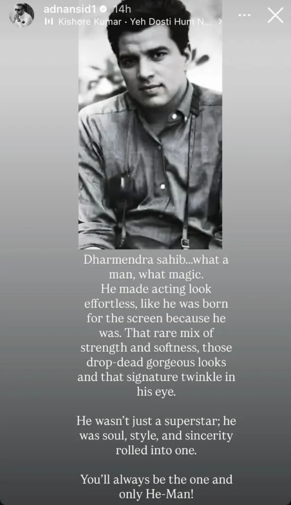 Actor Adnan Siddiqui wrote a heartfelt message, praising Dharmendra’s effortless charm and signature warmth: