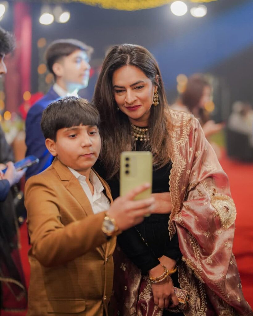 His son Shahzaman Khan was also seen wearing a dull golden sherwani, matching the family’s elegant and coordinated look.
