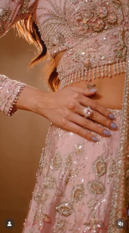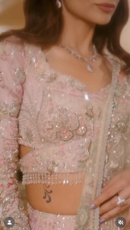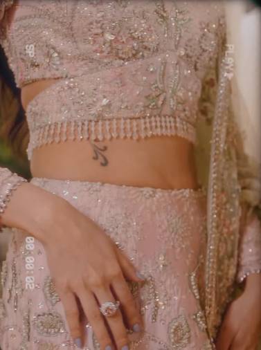 The reel features Zoya wearing a tea pink lehnga, designed by the well-known designer Saira Rizwan. At first glance, the outfit looks graceful and festive. However, many viewers noticed that the camera focus keeps shifting to something else a small tattoo on the side of Zoya’s stomach.