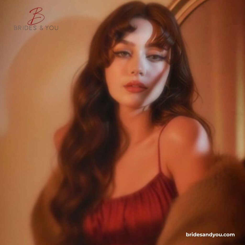 Her hair flows in loose waves, parted neatly in the center. The natural fall of her hair frames her face beautifully and keeps the look effortless.