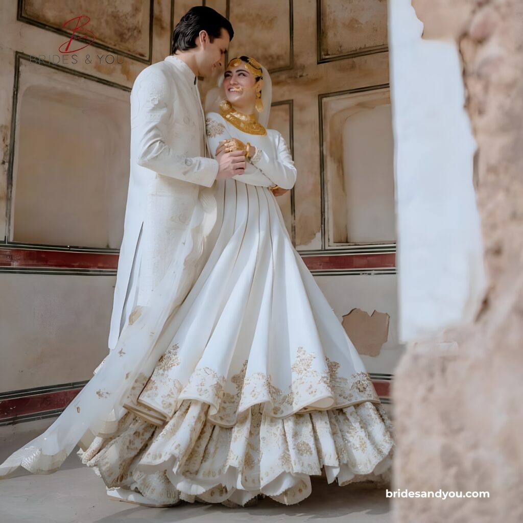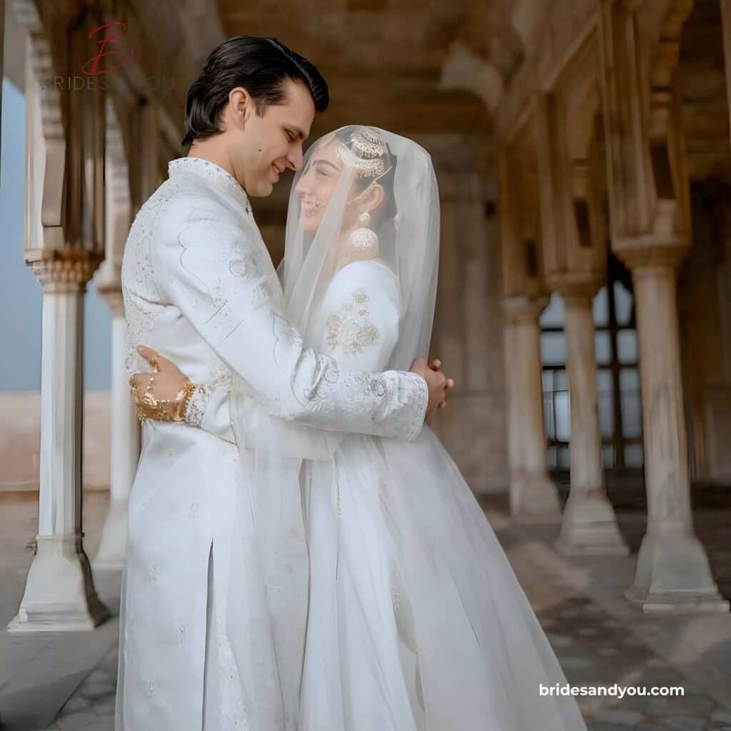 Taimoor matched her look with a white sherwani adorned with subtle gold work. Together, they looked calm, graceful, and deeply in love.
