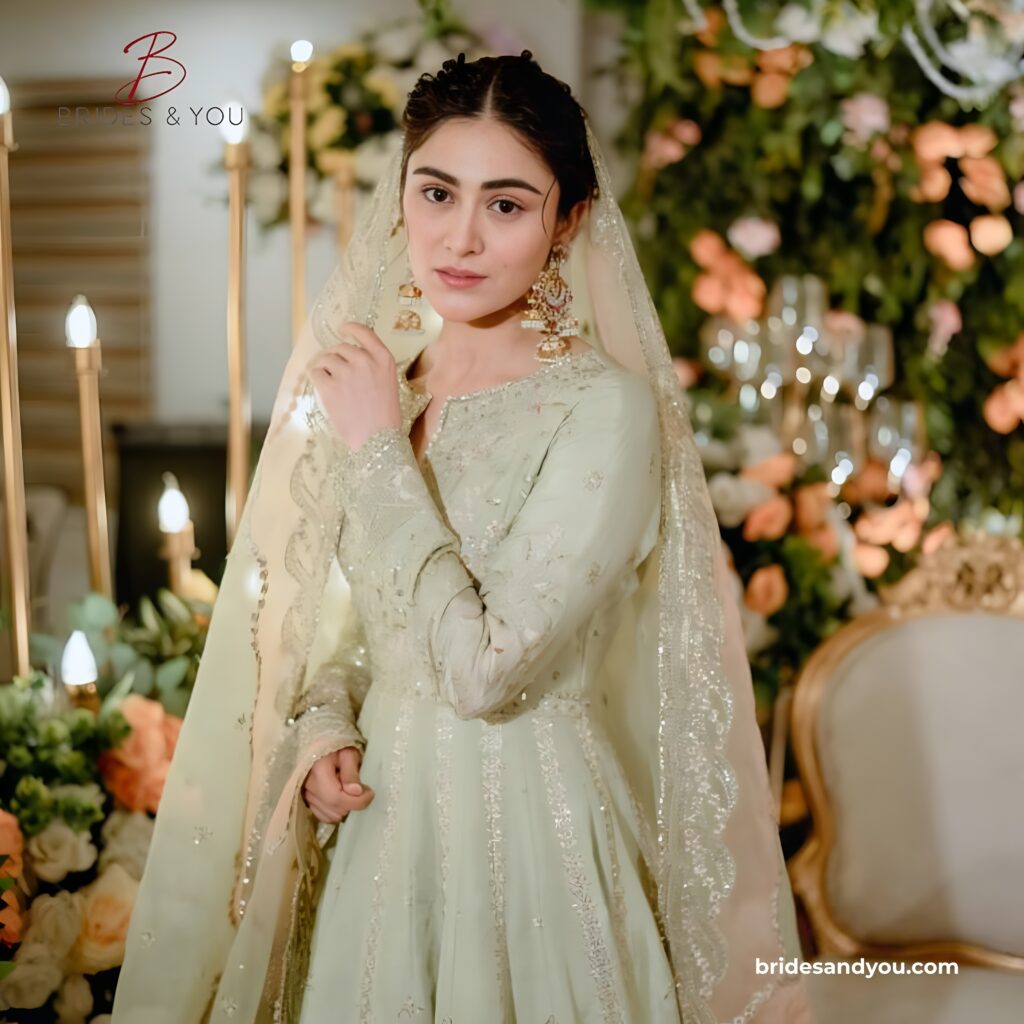 Following the mayon, Hina posted pictures from her dholki night. She wore a mint green frock with delicate silver details, paired with a soft net dupatta.