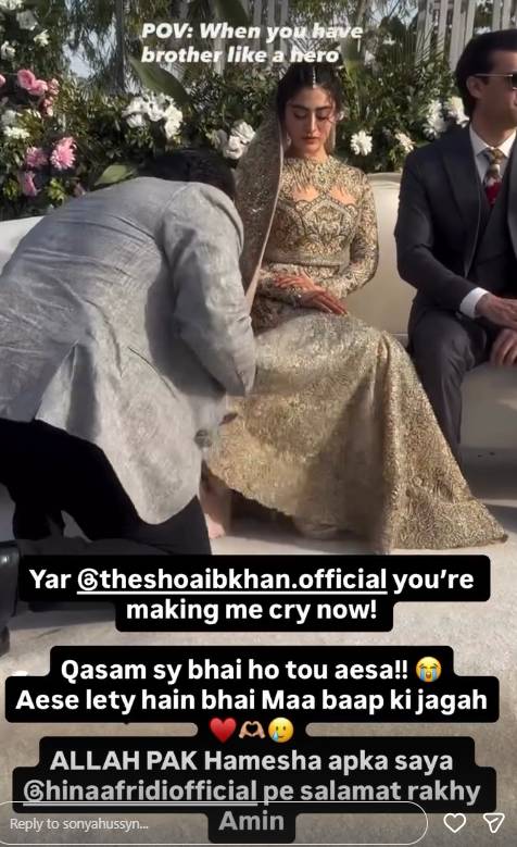 Sonya reshared a heart-touching video on her Instagram Story that showed Hina Afridi’s brother gently fixing his sister’s wedding outfit. The simple act carried deep meaning and instantly touched the hearts of viewers across platforms.