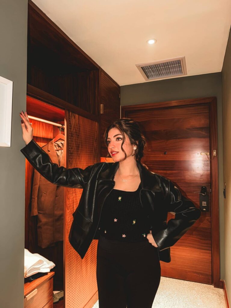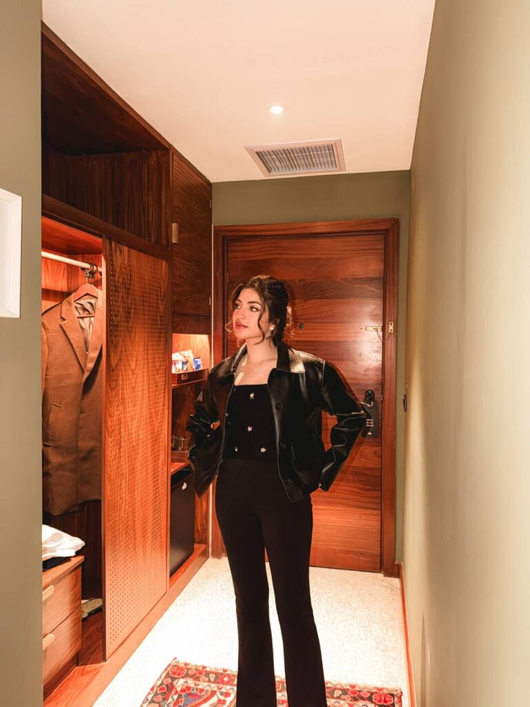 One standout image showed Kinza sitting at an outdoor café, dressed in a denim jacket and sunglasses. The look struck a perfect balance between casual and chic, reinforcing her reputation for effortless style.
