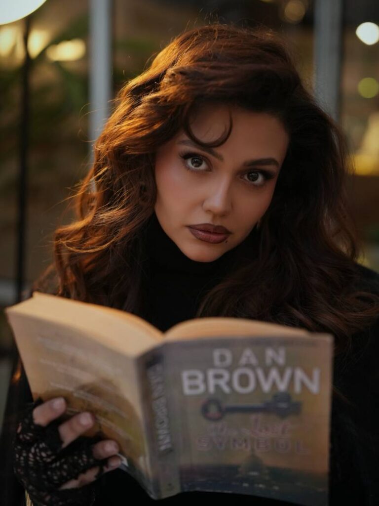 She appeared relaxed yet powerful, holding a cup of coffee and a book, creating an intellectual and introspective vibe.
