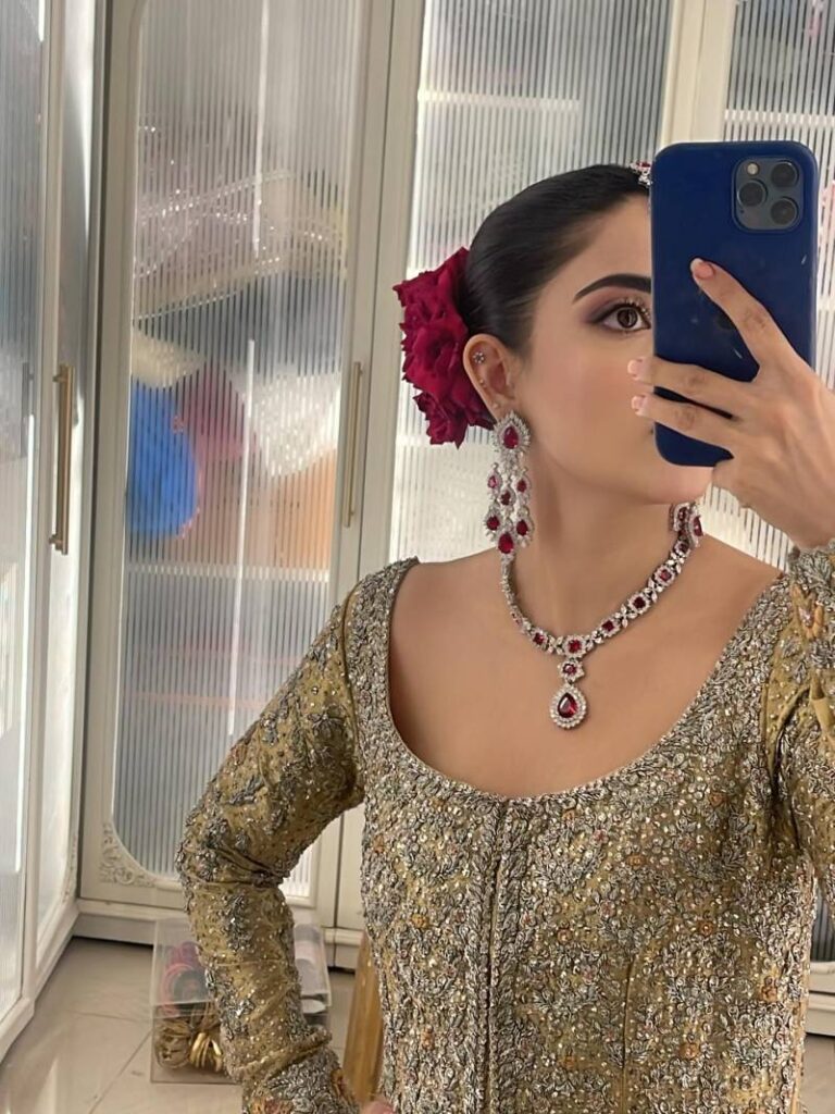Saboor paired the outfit with ruby and kundan jewelry, including a bold choker, long earrings, and a classic teeka. Her hair was styled in a neat bun, decorated with deep red roses that added warmth to the look.