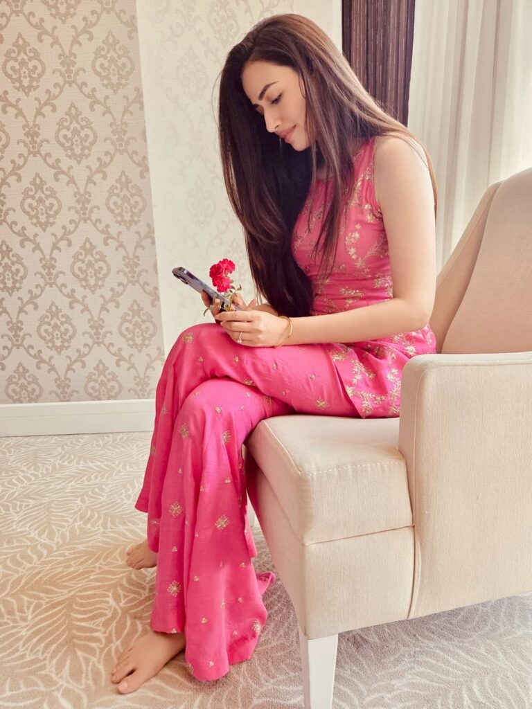 Sana Javed, who recently shared a calm indoor picture on Instagram, looked effortlessly graceful as she glanced at her phone. A small red flower placed beside her added a subtle pop of color to the frame.