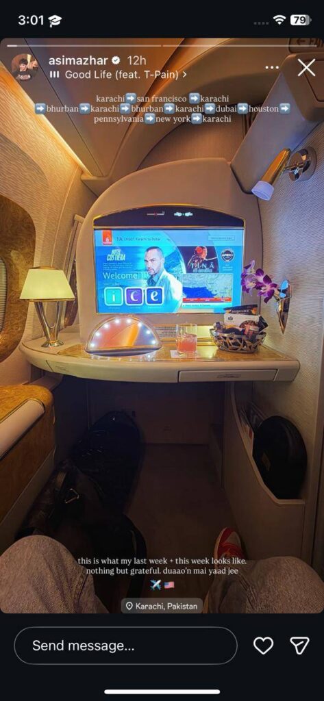 Sharing a snapshot from what appeared to be an Emirates first-class cabin, Asim posted his travel trail like a checklist: Karachi to San Francisco, back home, then Bhurban, Dubai, Houston, Pennsylvania, New York, and finally Karachi again. The image, complete with flowers, snacks, and a massive in-flight entertainment screen, reflected the glamorous side of life on the move but Asim kept things grounded.