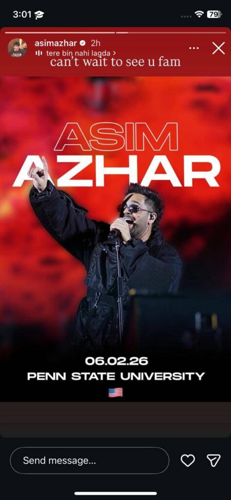 Amid all the travel updates, the real highlight came when Asim officially announced his upcoming live concert at Penn State University, USA, scheduled for February 6, 2026. The promotional poster shows him mid-performance, dressed in black and wearing sunglasses, exuding confidence and stage presence. Adding a personal touch, he wrote, “Can’t wait to see u fam,” with Tere Bin Nahi Lagda playing in the background.