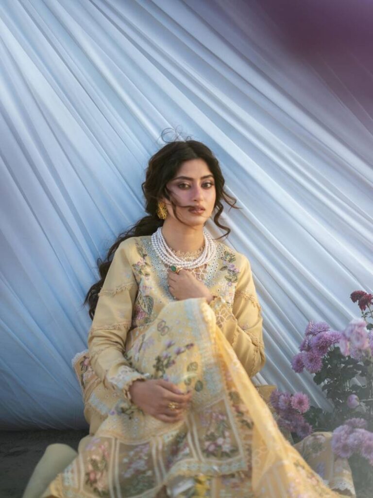 One of the standout looks features Sajal in a pristine ivory outfit, delicately embroidered with soft pastel florals. The look feels airy yet refined, capturing a quiet elegance that defines the collection’s mood. In another striking frame, she appears in a butter yellow ensemble paired with pearls, shot against a glowing sunset by the sea romantic, serene, and undeniably luxurious.