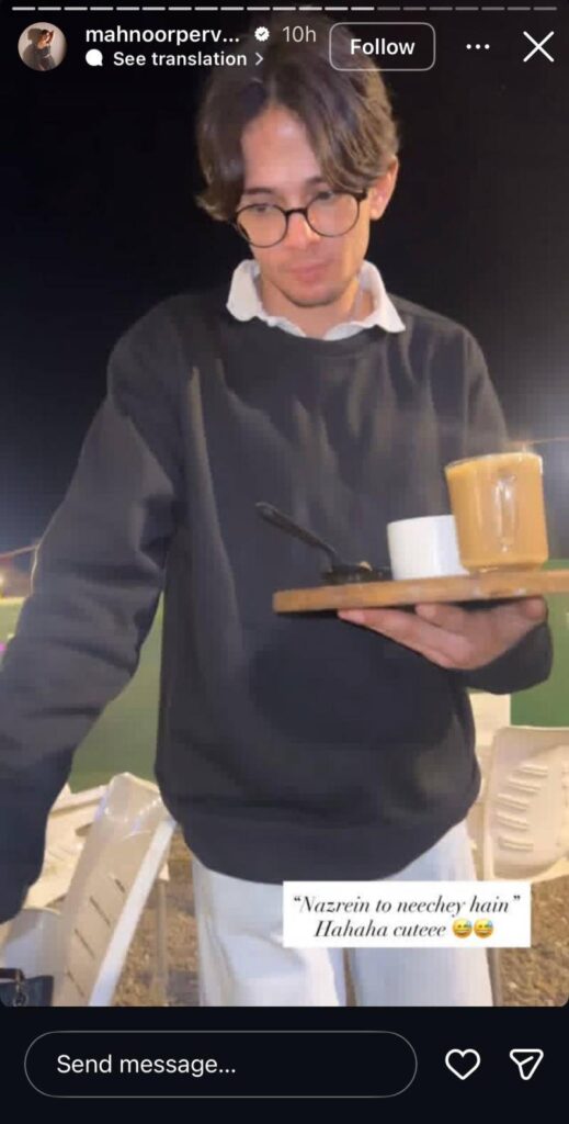 In the clips, the waiter cautiously balanced a wooden tray filled with tea, eyes cast downward as the group jokingly teased him for blushing. Playful captions like “Nazrein to neechey hain” and “Zoya se sharma gaye bhai” added to the humor, showing a genuine, relatable slice of life. Mahnoor even added a cheeky caption: “Tamasha season 3 in full swing,” humorously framing the casual gathering as a reality-TV-style drama without the chaos.