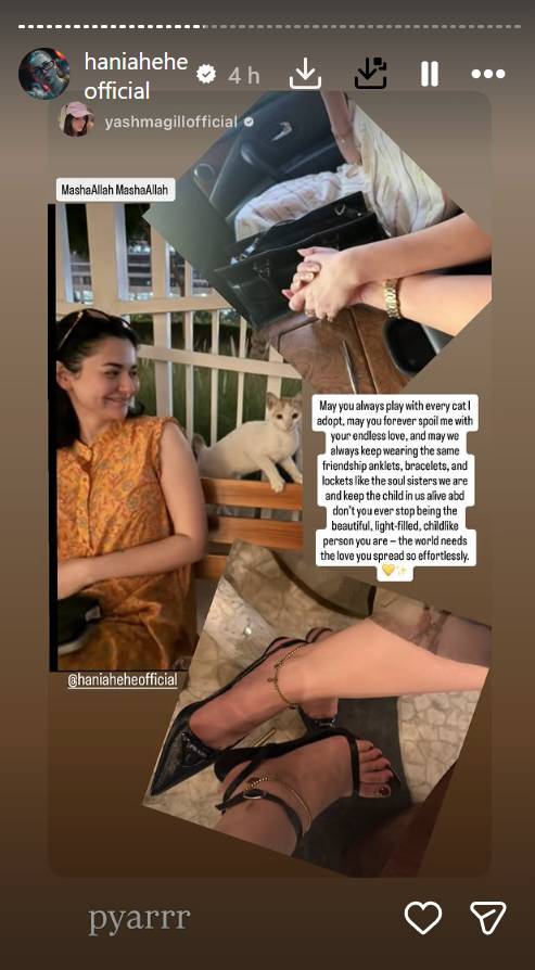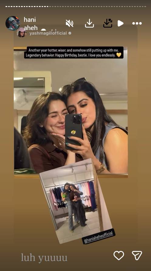 But what truly made Hania Aamir 29th birthday unforgettable was the overwhelming love from her inner circle. Actress Yashma Gill led the celebrations with a series of emotional Instagram stories, calling Hania her “safe place,” “chaos partner,” and “forever sister.” Sharing adorable collages and mirror selfies, Yashma didn’t hold back, describing her best friend as her “chosen family” and “heart outside my body.” One particularly sweet post showed the two twinning their friendship anklets, symbolizing a bond that fans have long adored.