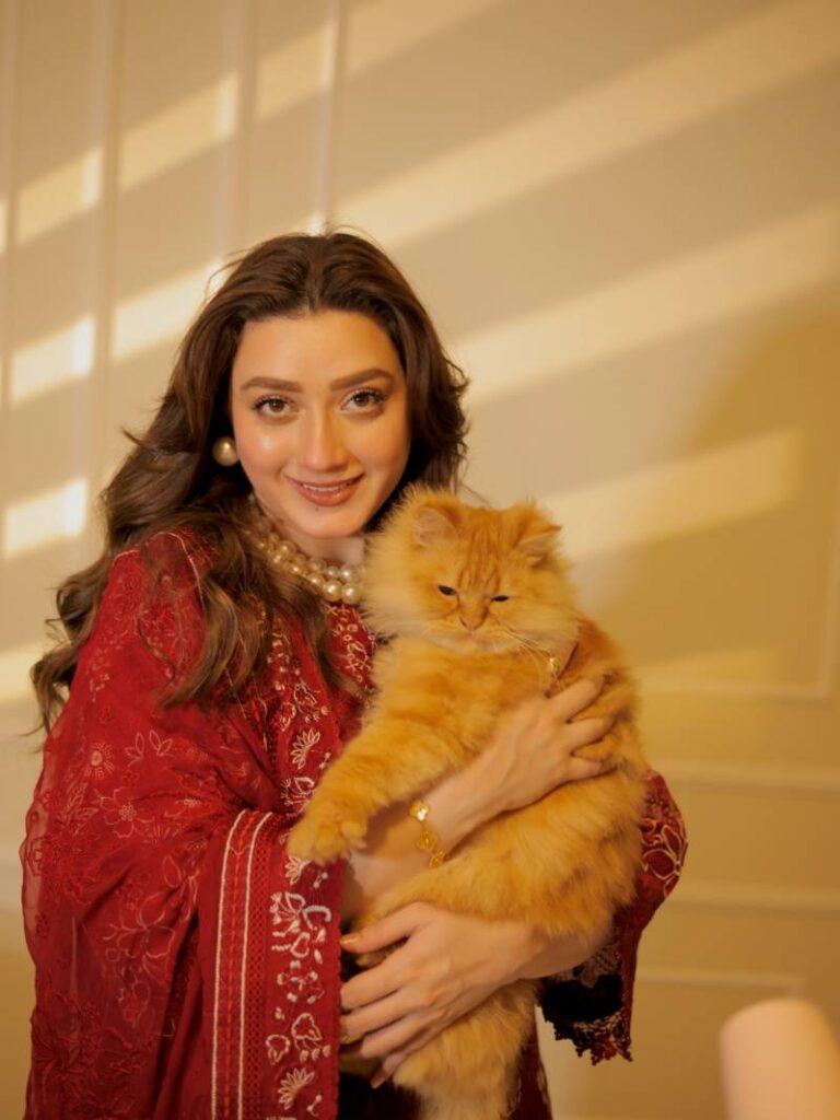 In a few candid moments, Momina interacted with a fluffy ginger Persian cat, adding warmth and personality to the otherwise high-glam setting. Close-up shots captured the fine embroidery and texture of the fabric, while soft-focus foreground elements created a dreamy, almost editorial-style finish.