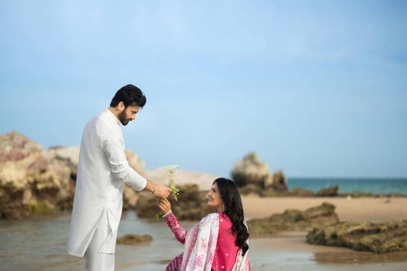 Titled “A Tale for Two,” the campaign unfolds against a peaceful beach setting. In one striking frame, Fawad Khan is seen holding a camera, capturing Ayeza’s portrait with waves crashing softly in the background. The visual storytelling gives the campaign a romantic, escapist mood perfect for an Eid collection reveal.