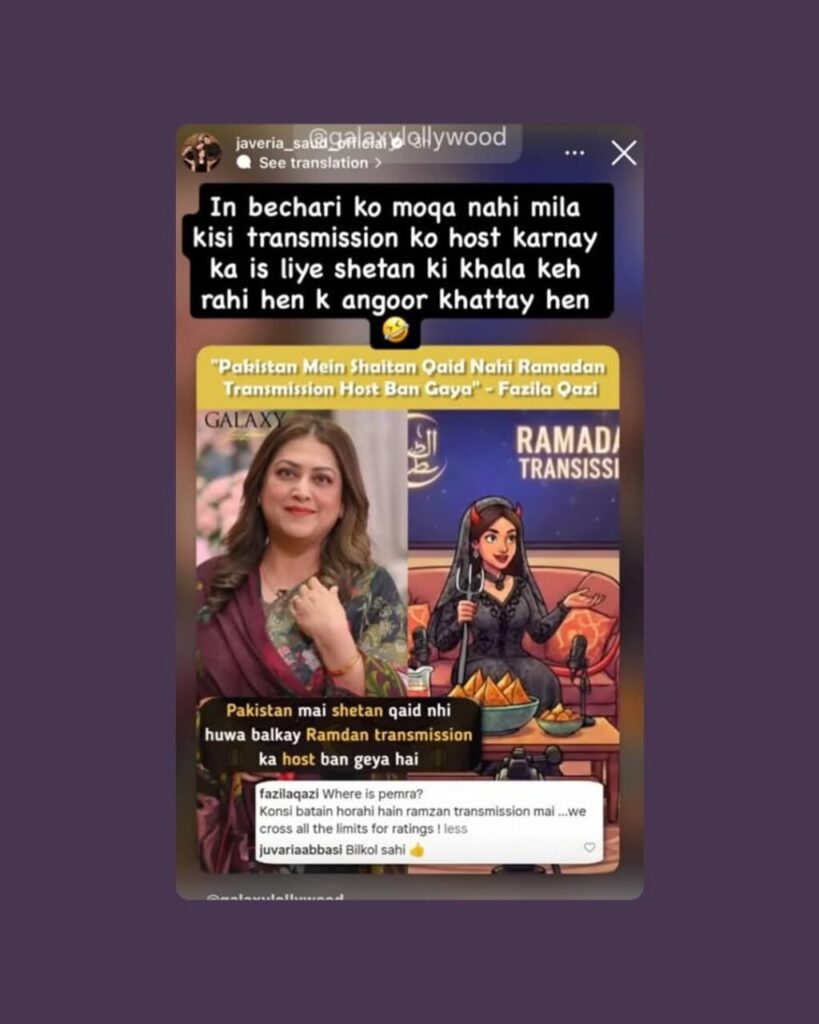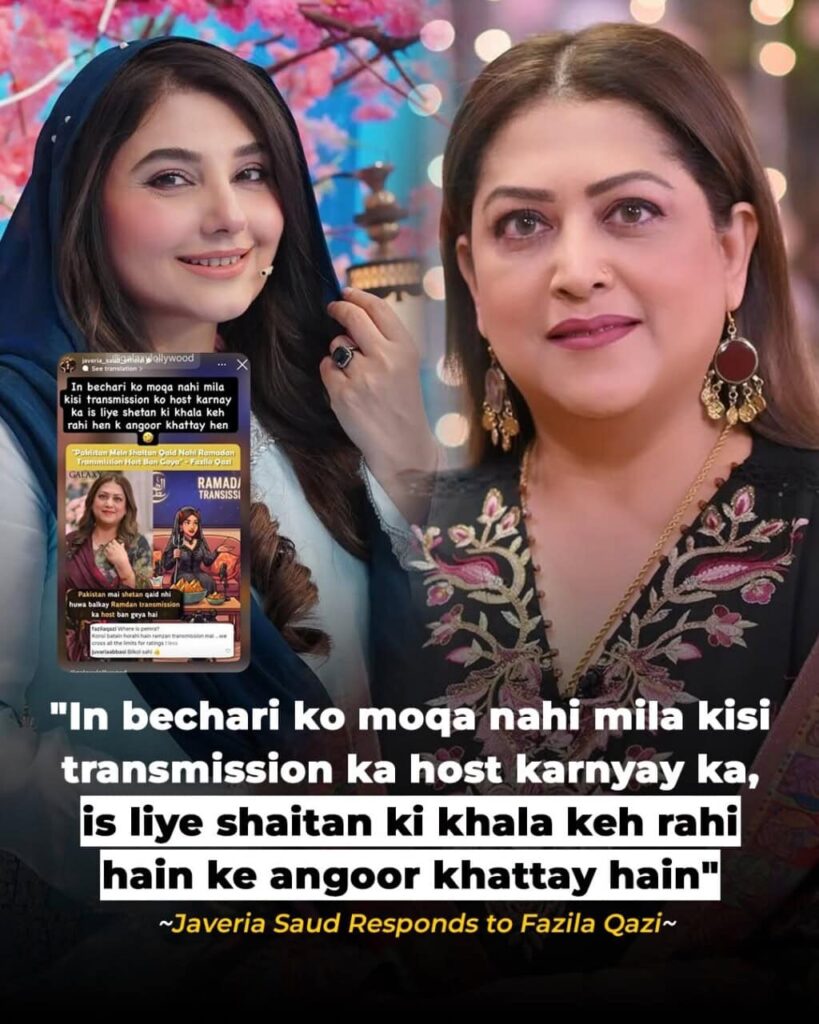 Amid the growing TRP race, senior actress Fazila Qazi openly criticized Ramzan programming. In a strong statement, she suggested that instead of promoting spiritual values, some shows are encouraging negativity and controversy. Her remarks did not sit well with everyone, especially Javeria Saud, who responded by implying that criticism often comes from those not offered hosting opportunities.