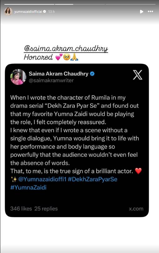 Yumna later reposted the compliment on Instagram with the caption “Honored,” while tagging the writer a small but heartfelt gesture that reflected her respect and gratitude.