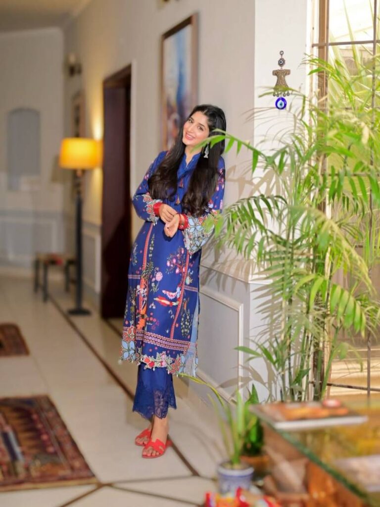 In the photos, the Mawra Hocane floral kurta features delicate garden-inspired prints with birds and blooming flowers scattered across the rich blue fabric. The kurta is paired with matching dark blue culottes, creating a coordinated and elegant look that feels both festive and effortless.