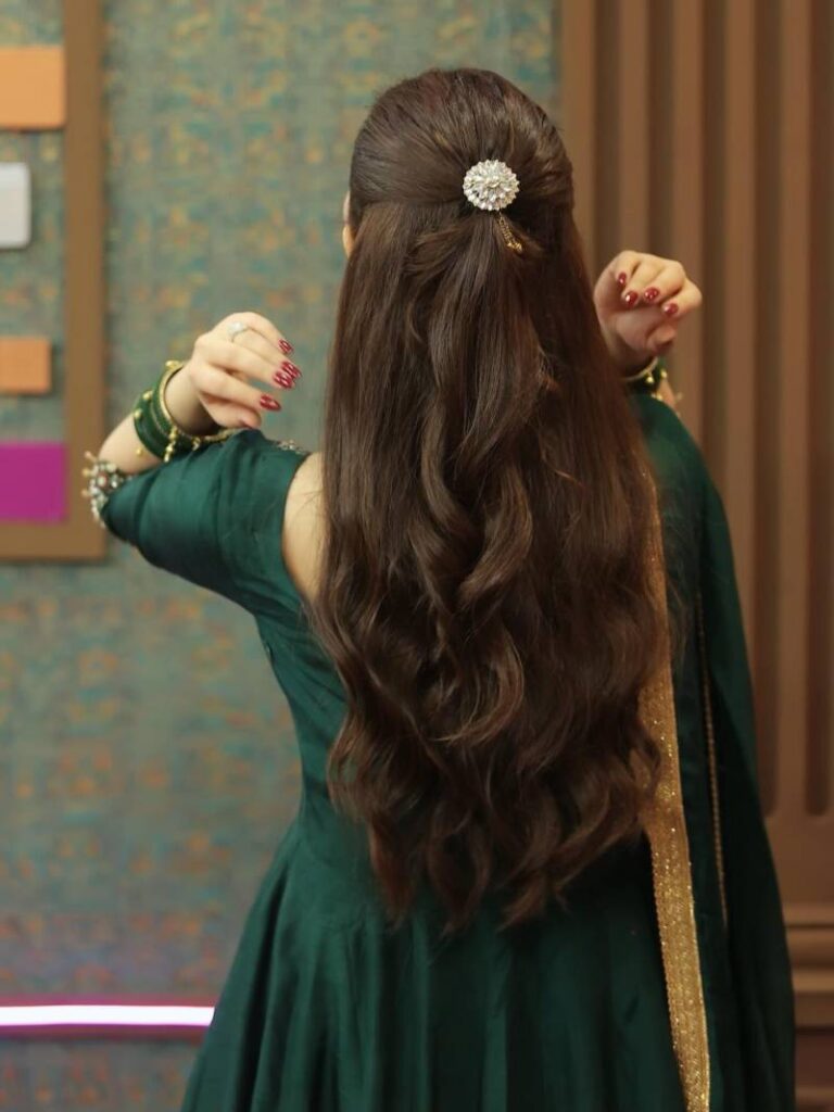 Her hair was styled in a soft half-up, half-down look, with loose waves cascading down her back. A delicate hair accessory added a festive touch without overpowering the overall aesthetic.