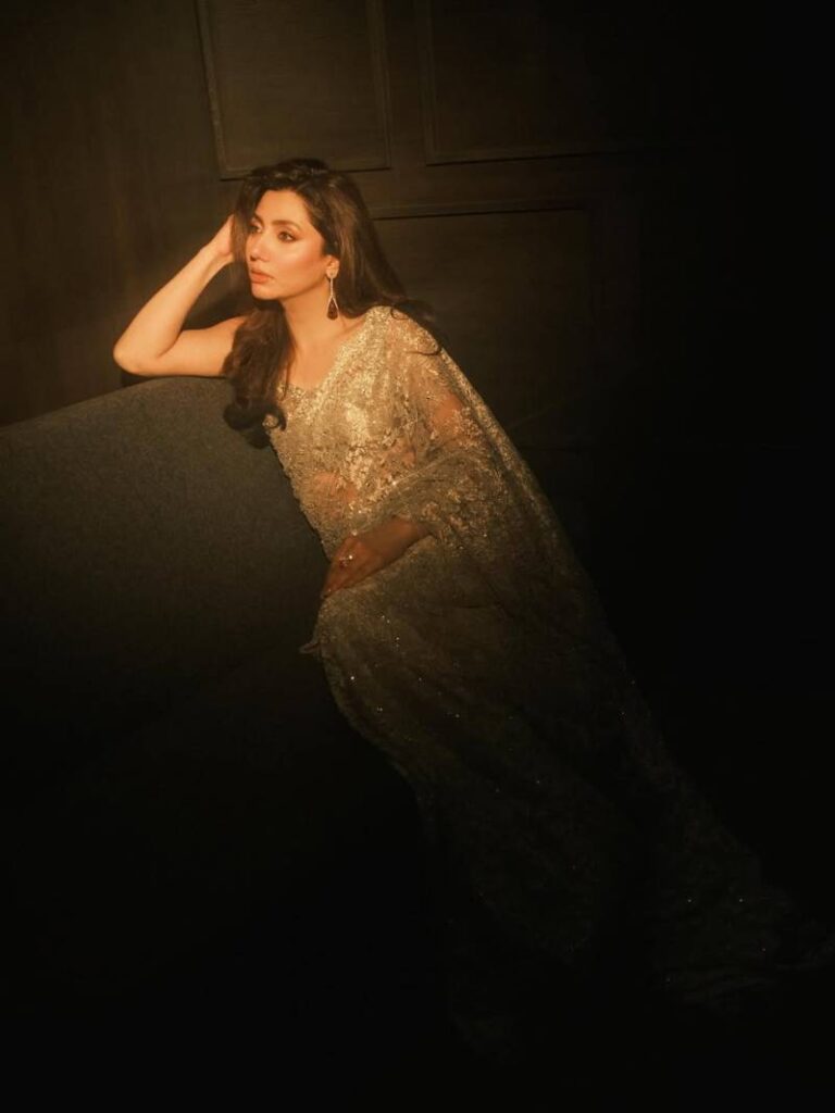 There was something quietly powerful about the look. Draped in a delicately embellished saree, Mahira leaned into understated luxury rather than over-the-top glamour. The ensemble shimmered subtly under soft lighting, with intricate detailing that added depth without overpowering her natural elegance.