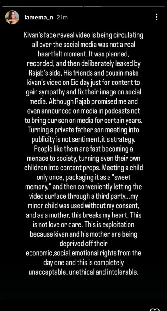 Taking to Instagram, Eman didn’t hold back. She clarified that the child shown in the video is not her son Kivan, and the footage itself is allegedly AI-generated. Calling it outright exploitation, she urged people to stop using her minor child’s identity for content and engagement.