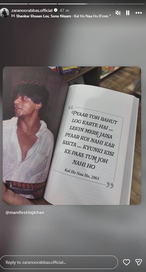 Meanwhile, Zara Noor Abbas didn’t just stop at sharing family moments. She layered her stories with emotional depth and personality. In one post, she paid tribute to Bollywood icon Shah Rukh Khan by sharing a romantic quote, adding a nostalgic and dreamy vibe.