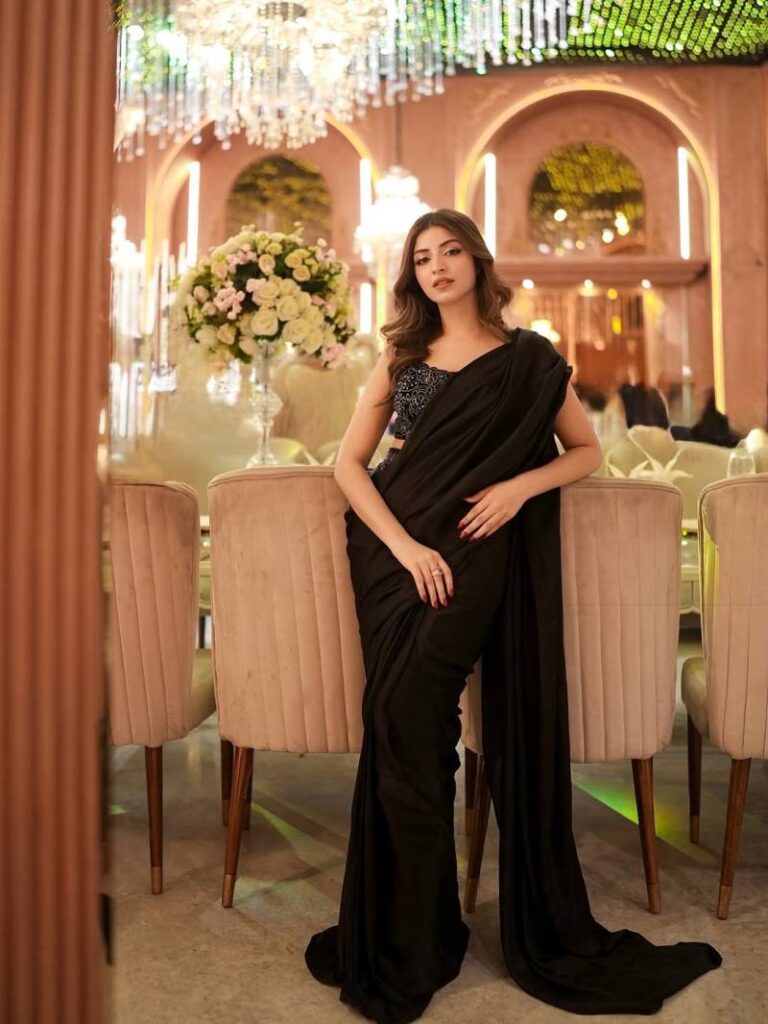 The highlight of this look was its simplicity paired with striking details. The black saree featured a smooth, luxurious fabric that flowed effortlessly, creating a refined silhouette. However, what truly elevated the outfit was the contrasting blouse.