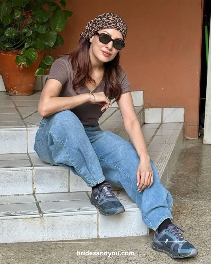 What makes Mehwish Hayat street style stand out is its balance. She blends comfort with bold fashion choices. This time, she paired a fitted V-neck top with oversized denim. The combination created a relaxed yet structured silhouette.